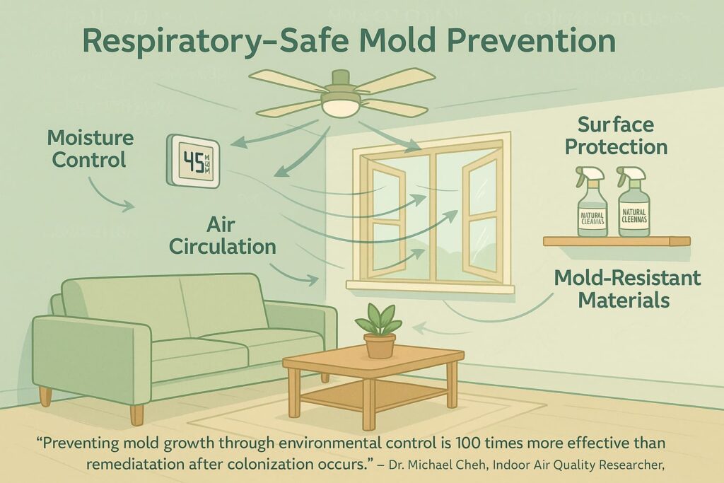 Respiratory-safe mold prevention is a comprehensive approach combining humidity control, proper ventilation, and non-toxic cleaning methods to maintain indoor environments below 50% relative humidity where mold cannot proliferate. This methodology emerged from research linking chronic respiratory conditions to indoor mold exposure, particularly affecting 10-15% of the population with mold sensitivity.